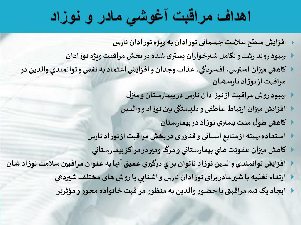 تذکر: در هنگام انجام مراقبت کانگرویی پوشش کامل مادر براساس موازین فرهنگی- اسلامی الزامی است.