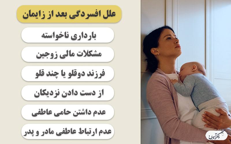 اندوه پس از زایمان : در چند روز اول بعد از زایمان ممکن است به دلیل فشارهای روانی ناشی از ترس و هیجان بارداری و زایمان ورود نوزاد و تغییرات ایجاد شده در خانواده خستگی ناشی از کم خوابی اواخر بارداری، نگرانی در مورد مراقبت از نوزاد در ساعاتی از روز اندوهگین شوید. تغییرات خلق و خو و رفتار شامل گریه کردن خود به خود، بی علاقگی نسبت به هر فعالیت بیخوابی یا پرخوابی تغییرات ،وزن، خستگی و کاهش انرژی است. این حالات معمولاً طی هفته اول پس از زایمان مشاهده میشود و تا روز دهم بهبود می یابد. همسر و اطرافیان نقش بسیار مهمی در بهبود این وضعیت دارند آنان باید بدانند که تغییرات روحی در مادر طبیعی و گذراست و لازم است در این مدت به مادر توجه و محبت بیشتری شود. در صورت طولانی شدن این علائم و یا بروز علائم دیگری مانند آزار نوزاد باید با روانپزشک کنید.
